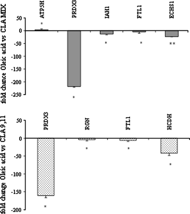 Statistical analysis of significantly up- and down-regulated proteins involved in lipid metabolism. As a control the oleic acid-treated hepatocytes have been considered. CLA mix (upper panel) and c9,t11 CLA (lower panel) have been demonstrated effective in modifying the expression levels of the indicated liver proteins (Student’s t test: *P < 0.05; **P < 0.01)