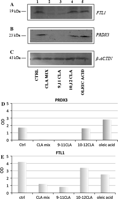 Western blotting of hepatocytes lysates treated with CLA isomers and oleic acid. For each protein line, the following samples have been analyzed: control hepatocytes (line 1); CLA mix-treated hepatocytes (line 2); c9,t11 CLA-treated hepatocytes (line 3); t10,c12 CLA-treated hepatocytes (line 4); oleic acid-treated hepatocytes (line 5). Equal amounts of cell lysates were subjected to SDS-PAGE and probed with anti-FTL1 (a) and anti-PRDX3 (b) specific antibodies. Expression of β-Actin was used to normalize protein loading (c). Protein sizes are reported in the left side of each panel. Densitometric analysis of band intensity is reported for PRDX3 (d) and FTL1 (e), where optical density (OD) values have been used as arbitrary unit