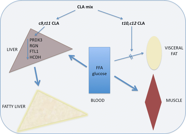 Several studies already demonstrated that CLA profoundly reduces body weight and body fat mass in different species and also alters hepatic liver metabolism (Vyas et al. 2012). The mechanism of action through which CLA may work to decrease body fat is still unclear: this represents a pivotal issue since CLA is suggested as a dietary supplement in humans. It has been suggested an increase in the lipogenetic activity of the liver as a consequence of the large reduction in fat body mass; in this situation, the blood glucose would be metabolized to fatty acid and stored as triacylglycerol in the liver, rather than in the adipose tissue.