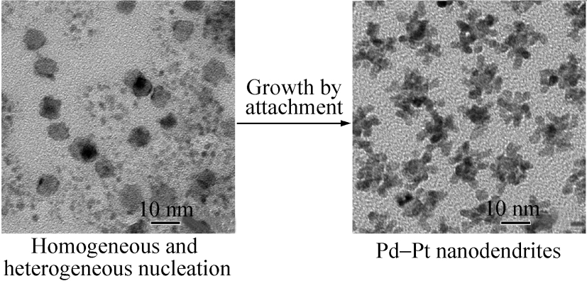 In a seed-mediated synthesis, nanocrystal growth is often described by assuming the absence of homogeneous nucleation in the solution. Here we provide new insights into the nucleation and growth mechanisms underlying the formation of bimetallic nanodendrites that are characterized by a dense array of Pt branches anchored to a Pd nanocrystal core. These nanostructures can be easily prepared by a one-step, seeded growth method that involves the reduction of K2PtCl4 by L-ascorbic acid in the presence of 9-nm truncated octahedral Pd seeds in an aqueous solution. Transmission electron microscopy (TEM) and high-resolution TEM analyses revealed that both homogeneous and heterogeneous nucleation of Pt occurred at the very early stages of the synthesis and the Pt branches grew through oriented attachment of small Pt particles that had been formed via homogeneous nucleation. These new findings contradict the generally accepted mechanism for seeded growth that only involves heterogeneous nucleation and simple growth via atomic addition. We have also investigated the electrocatalytic properties of the Pd-Pt nanodendrites for the oxygen reduction and formic acid oxidation reactions by conducting a comparative study with foam-like Pt nanostructures prepared in the absence of Pd seeds under otherwise identical conditions.