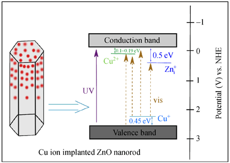 Utilization of visible light is of crucial importance for exploiting efficient semiconductor catalysts for solar water splitting. In this study, an advanced ion implantation method was utilized to dope Cu ions into ZnO nanorod arrays for photoelectrochemical water splitting in visible light. X-ray diffraction (XRD) and X-ray photo-electron spectroscopy (XPS) results revealed that Cu+ together with a small amount of Cu2+ were highly dispersed within the ZnO nanorod arrays. The Cu ion doped ZnO nanorod arrays displayed extended optical absorption and enhanced photoelectrochemical performance under visible light illumination (λ > 420 nm). A considerable photocurrent density of 18 μA/cm2 at 0.8 V (vs. a saturated calomel electrode) was achieved, which was about 11 times higher than that of undoped ZnO nanorod arrays. This study proposes that ion implantation could be an effective approach for developing novel visible-light-driven photocatalytic materials for water splitting.