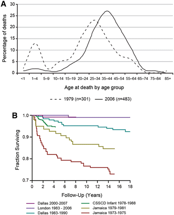Improving survival of children with sickle-cell disease. a Age at death for individuals with sickle-cell disease in 1979 and 2006 [4]. b. Overall survival estimates for children with HbSS and HbSβ0-thalassemia estimated from large, newborn cohorts in the United States, United Kingdom, and Jamaica [5]. Reprinted from Hassell [4], with permission from Elsevier, and republished with permission of American Society of Hematology from Improved survival of children and adolescents with sickle-cell disease. Quinn et al. [5]; permission conveyed through Copyright Clearance Center, Inc. CSSCD Cooperative Study of Sickle Cell Disease