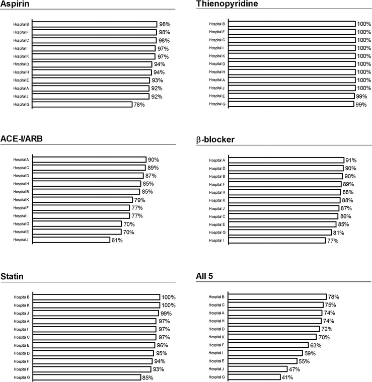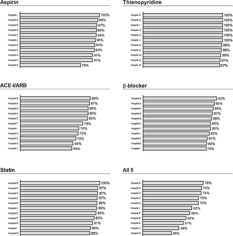 The 5 key guideline-recommended therapies of interest were aspirin, thienopyridines, ACE-I/ARBs, β-blockers, and statins. For the purpose of the present analysis, patients were divided into two subsets: those receiving all 5 pharmacological agents at discharge versus patients not receiving the 5-drug combination.