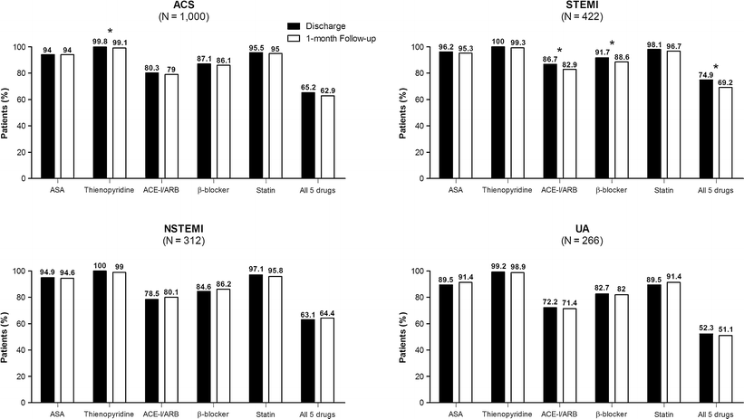 The guidelines of the European Society of Cardiology on the management of non-ST-segment elevation acute coronary syndromes (NSTE-ACS) [3] and ST-segment elevation myocardial infarction (STEMI) [4, 5], as well as the American College of Cardiology/American Heart Association guidelines recommend the collective use of these pharmacological agents for long-term treatment of patients after ACS [6]. Moreover, the prescription of these classes of agents at discharge is used as performance measures for patients with both ST-segment elevation and non-ST-segment elevation myocardial infarction [3, 7]. Nevertheless, there is evidence to suggest that patients with ACS are still not optimally managed with the aforementioned combination of agents after an acute coronary event [8].