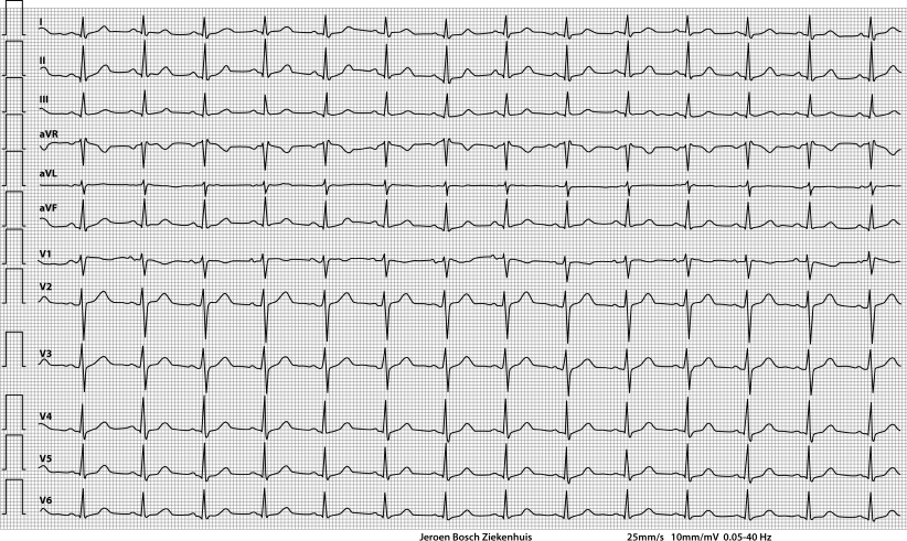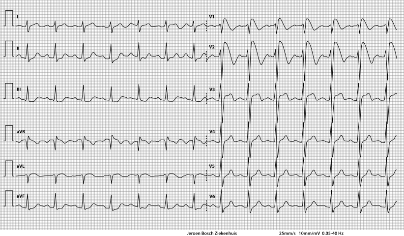 In patients with a psychiatric history, one should consider involvement of a tricyclic antidepressant (TCA), since TCAs are known to result in sodium channel blockade [2]. Our patient turned out to be using nortriptyline, a TCA, amongst other non-tricyclic antidepressants. Therefore, the suspicion of an intoxication with this drug was raised [3]. Indeed, blood tests showed toxic levels of nortriptyline (507 µg/l (therapeutic levels: 50–150 µg/l; toxic levels: >500 µg/l), E‑10-OH-nortriptyline 386 µg/l).