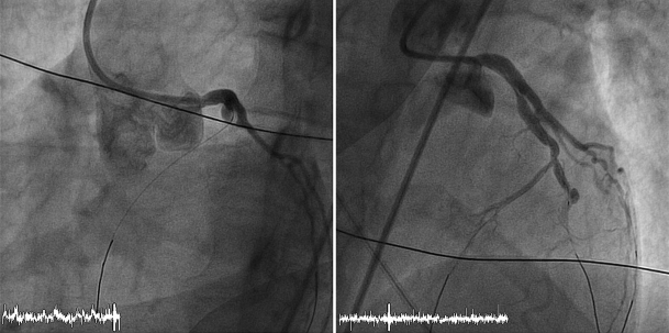 A coronary angiography of patient 1, showing occlusion of the left anterior descending artery distally from the first diagonal artery before and after treatment