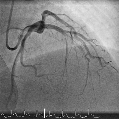 A coronary angiography of patient 2, showing an occlusion of the left main coronary artery and a dissection of the left anterior descending artery and circumflex coronary artery