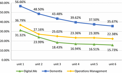 Although unit 1 was considered the first on the course, some learners on all three MOOCs took the opportunity to start with a different unit. The figures were 7.08% of learners on Digital.Me, 6.17% of learners on Dementia, and 5.15% on Operations Management. There were also groups of learners that completed at least one unit, but never completed unit 1. These figures were 2.65% of learners on Digital.Me, 2.08% Dementia, but only 0.33% on Operations Management.