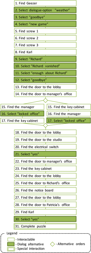 Two S-subjects were provided with hints during their game session, according to the 3 min rule presented above. The hints related to problems to locate items in the introductory step (CP 5–6) and problems with the dialog system. Four VI-subjects were provided with help and for three of those, it related to game logic. The fourth subject experienced problems with the introductory stage and dialog system.