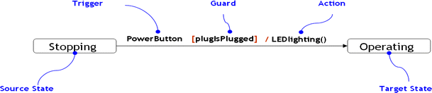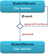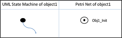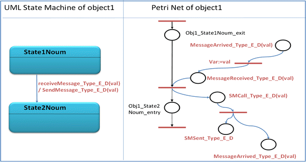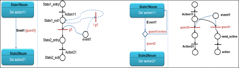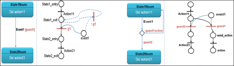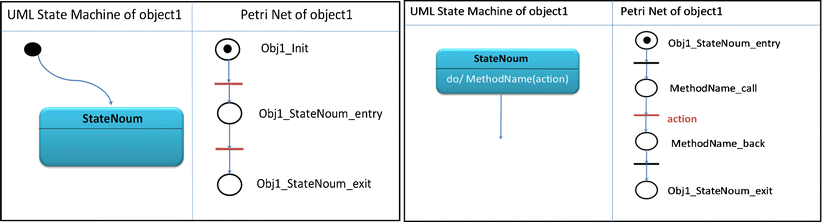 A simple state including an internal activity (do activity) is transformed like this: a place to enter the state, a transition, a place that marks the beginning of the “do activity”, a transition with an operator that defines the action to do in the activity, an exit place from the method that marks the end of the action, a transition to the place that marks the exit of the state.