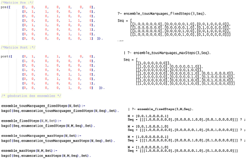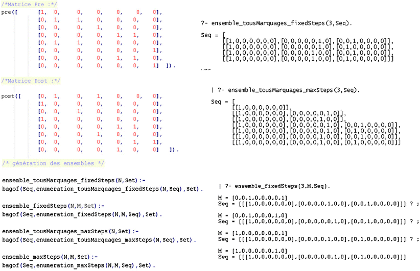 This algorithm is correct since the sequences found are effectively sequences of steps which produce the desired final marking. It is also complete since it can enumerate all the solutions of length lower than a given integer. In each iteration, the algorithm uses a mechanism of linear constraints solving. It has been implemented using the constraint logic programming software Prolog IV. The interest of the use of Prolog IV lies in the fact that its constraints resolution mechanism is incremental [15]. Indeed, it is not necessary to redefine in each iteration the constraints incorporated into the previous stage. The constraints are added in the constraints solver so that it can reuse the results of the previous constraints propagation. The search for the concrete results is made at the end by an enumeration of all the possible integer solutions.