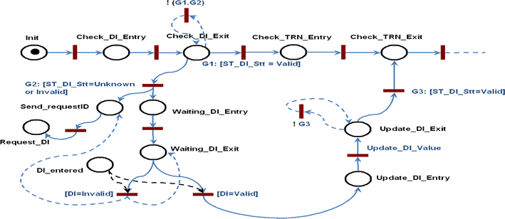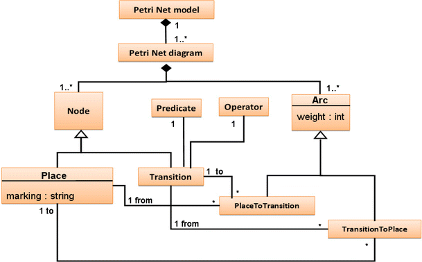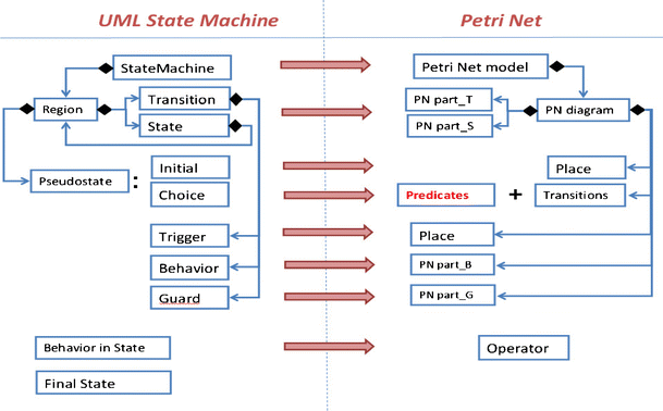 The Petri net is considered like the target formalism in the transformation technique. It consists of places, transitions, and arcs that connect them. Input arcs connect places with transitions, while output arcs start at a transition and end at a place. In addition, tokens are used in places in order to simulate the dynamic and concurrent activities of systems. The transitions model the activities which can occur, thus changing the state of the system. They are only allowed to fire if they are enabled, which means that all the preconditions for the activity must be fulfilled. As a mathematical tool, it is possible to set up state equations, algebraic equations, and other mathematical models describing the behaviour of systems [24]. In order to comply with UML State machine, the Petri net is enriched by the addition of operators and predicates. A predicate is associated to the transition and allows expressing of a condition guard. An operator allows performing of an action and is also associated to a transition.