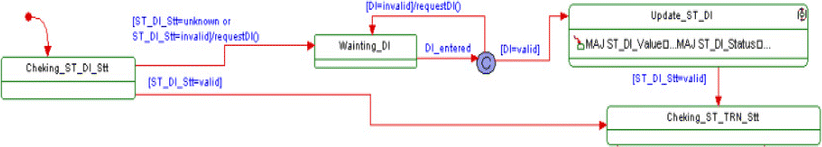In our study, the choice has two outgoing transitions with two guards. So the choice is transformed into two transitions in the corresponding Petri net. A predicate is associated to each transition representing guards of the state machine (Fig. 11).