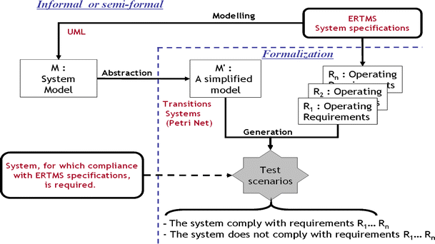 Regarding ERTMS specifications, FRS (Functional Requirement Specifications) and SRS (System Requirement Specifications) contain functional requirements at system level, which place the core of this study in the functional testing field. However, the structure of the specifications (inputs, outputs, requirements) is not formal enough and, therefore, not appropriate to the preparation of test scenarios. The objective of this work consists in producing “standard bricks” which will describe and specify each requirement. Then, a transformation process allows obtaining formalised models which will be used in this work. This formalisation requires analysing, classifying, and structuring of the specifications.