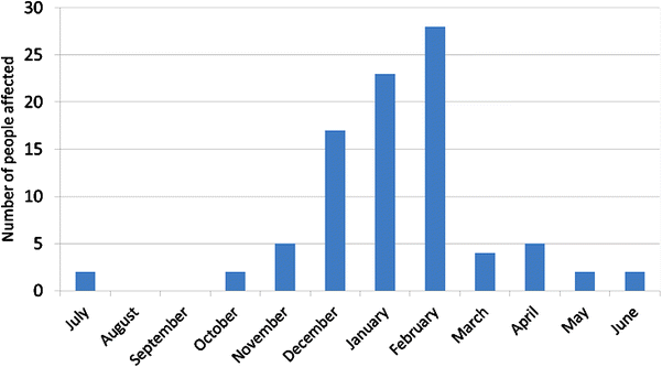 In a UK study of 39 oyster production areas, NoV was detected in 76.2% of shellfish samples tested. Of these, GI was detected at 20.9% of sites, GII detected at 7.7% of sites and GI and GII both detected at 47.6% of the sites (Lowther et al. 2012a; FSA 2011; CEFAS 2011a, b; CEFAS 2014). The concentration of NoV varied widely, with maxima of 16,507 gc g−1 for GI and 18,024 gc g−1 for GII. High concentrations were relatively infrequent, with most samples containing detectable NoV levels below the limit of quantification (LOQ) of 100 gc g−1 (Lowther et al. 2012a). NoV shows a marked seasonal pattern, with maximum contamination levels observed in the winter months, and minimum levels in summer (FSA 2011; Keaveney et al. 2009; Woods and Burkhardt III 2010). CEFAS (2011b) suggests that NoV is negatively linked to temperature as contamination from oysters is derived from contaminated human faecal matter, which principally occurs due to NoV outbreaks in winter months (Lopman et al. 2009). Detection rates for oysters were 90% in winter (October to March), compared with 62% in summer (April to September), with extremes observed near the end of these periods. Maximum detection occurred in February 2010 (100%), and minimum detection (46%) was measured in September 2010.
