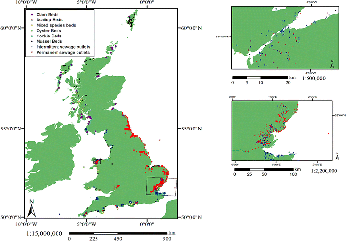 Shellfish areas and sewage outflow distribution in UK waters. Insert top—Northwest Wales coast; inset bottom—Southeast England