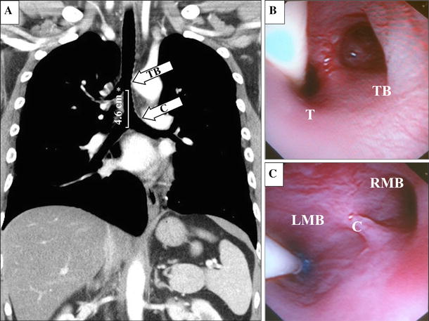 A) A preoperative computed tomography scan of the patient’s chest revealed a tracheal bronchus (TB; asterisk) of the right upper lobe originating from the middle of the trachea (T) 4.6 cm above the carina. The labelled upper and lower white arrows correspond to the fibreoptic bronchoscopic (FOB) views at the level of the tracheal bronchus bifurcation and the carina (C), respectively. B) The FOB view of the tracheal bronchus bifurcation that appears to mimic the appearance of a normal carinal bifurcation. C) The FOB view showing the carina, right mainstem bronchus (RMB), and the properly positioned endobronchial blocker in the left mainstem bronchus (LMB)