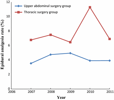 Although our study used a large national sample, there are several limitations relating to the use of retrospective administrative datasets, such as errors in coding and an inability to retrieve relevant data other than what is provided in the dataset. The NIS used only ICD-9-CM codes for epidural placement during the study period; however, many hospitals use the current procedural terminology codes in their discharge records. Consequently, we may have missed some patients who received epidural analgesia. The database does not provide clinically relevant information regarding the epidural technique (e.g., the type, loading dose, and rate of administration of local anesthetic and opioids used) or the duration of the postoperative epidural drug administration. The temporal relationship between the fall and epidural analgesia was not recorded in the database; therefore, falls could have occurred several days after discontinuation of epidural analgesia without any relationship. Although we identified a relatively large number (> 2,000) of patients who experienced inhospital falls following major upper abdominal and thoracic surgery, we acknowledge that a relatively small percentage (< 9%) of patients received epidural analgesia. Large prospective studies are necessary to disassociate postoperative epidural analgesia more definitively from inhospital falls in these patient populations.