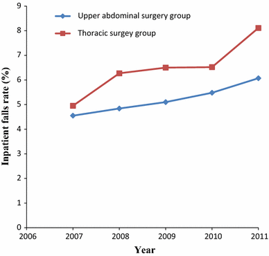 Forty-two thousand six hundred fifty-eight thoracic and 54,974 upper abdominal surgical procedures were identified. The overall incidence of inpatient falls in the thoracic surgery group was 6.54% with an increasing trend over the study period from 4.95% in 2007 to 8.11% in 2011 (P < 0.001). Similarly, the overall incidence of inpatient falls in the upper abdominal surgery group was 5.30% with an increasing trend from 4.55% in 2007 to 6.07% in 2011 (P < 0.001). Postoperative epidural analgesia was not associated with an increased risk for postoperative inpatient falls in the thoracic surgery group (relative risk [RR], 1.18; 95% confidence interval [CI], 0.95 to 1.47; P = 0.144) and in the upper abdominal surgery group (RR, 0.84; 95% CI 0.64 to 1.09; P = 0.220). Inpatient falls compared with non-falls were associated with a longer median (interquartile range) length of hospital stay in both the thoracic surgery group (11 [7-17] days vs 9 [6-16] days, respectively; P < 0.001) and the upper abdominal surgery group (12 [7-20] days vs 10 [6-17] days, respectively; P < 0.001).