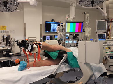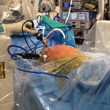 A photograph of the operative setup and arthroscopic instrument insertion for hip arthroscopy in the lateral position