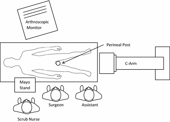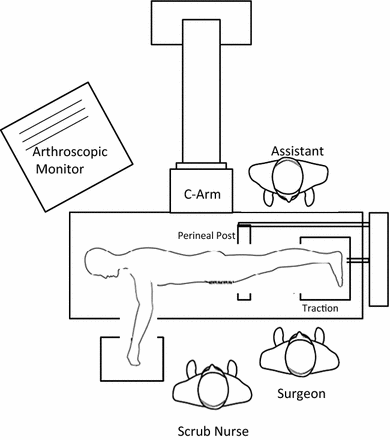 Schematic diagram of the operating room setup for hip arthroscopy performed in the supine position. Notice that the operative hip is placed in extension with approximately 25° of abduction and with neutral rotation. The perineal post is lateralized to the operative side