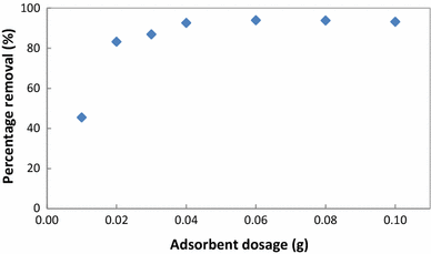 The three particles sizes, >850 μm, 355–850 and <355 μm, resulted in dye removal of 60.8, 87.2 and 92.4 % respectively. The smaller the particle size, the higher the surface area and hence more functional groups are exposed for the interaction with dye molecules. As particle size of <355 μm gave the highest percentage removal, thus particle of this size was used for the rest of the experiment.