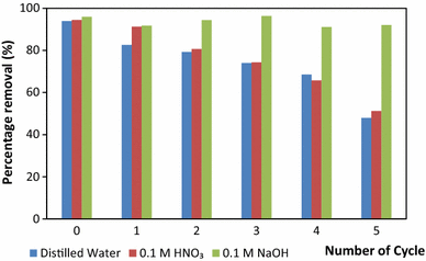 The regeneration experiments were examined for three different types of solvents: distilled water, 0.1 M HNO3 and 0.1 M NaOH. Three sets of adsorbent were treated with 100 mg L−1 MV to obtained MV-treated AP at the dosage of 0.04 g/20 mL dye. The MV-treated AP was washed with distilled water and shaken in an orbital shaker for 30 min. The washed solution was discarded and the same procedure was repeated until little desorption of dye from the adsorbent into the distilled water. The solid was subsequently dried in oven at 70 °C. Similar procedure was applied to the acid and basic wash, where 20 mL of 0.1 M acid or base added, shaken for 30 min and followed by multiple distilled water washing until pH of the washed solution became near neutral.