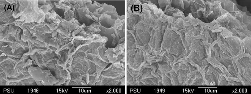 SEM images of a untreated AP, and b MV-treated AP treated, at ×2000 magnification