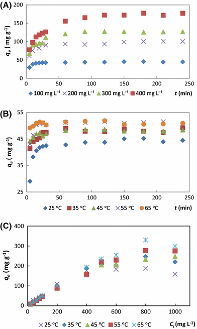 The time taken to reach equilibrium for C i at 100, 200, 300 and 400 mg L−1 were 60, 60, 90 and 120 min, respectively. Thus, agitation time of 120 min was chosen for all the experiments, to ensure complete equilibrium was attained.
