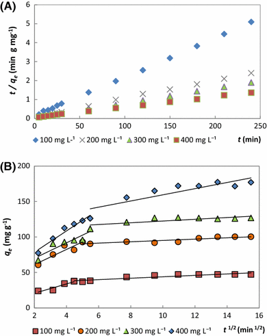 Plot of a pseudo 2nd order kinetic model, and b Weber-Morris model displayed multi-linearity behavior, for C i of 100, 200, 300 and 400 mg L−1 MV adsorption by AP at dosage of 0.04 g/20 mL dye, at room temperature and ambient pH