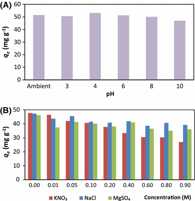 Pre-treatment of adsorbents have been known to enhance their adsorption capacity towards dyes [25]. Here, AP was subjected to various treatment in order to investigate if such chemical treatment could enhance its adsorption capacity towards MV dye. The q e of untreated, oxalic acid, citric acid, phosphoric acid and NaOH-treated adsorbent were 79.8, 47.9, 46.4, 45.6 and 71.3 mg g−1, respectively, where the untreated adsorbent lead to the highest dye removal. Modification with NaOH yielded almost similar q e with untreated AP, which may be due to exposure of favourable chemical-active groups for removal of MV as explained in the regeneration section. Modification with the acids did not improve the removal of MV, and it may be due to the removal of certain soluble organic compounds [52] that favour the removal of MV. It was reported that not all modifications of adsorbent lead to higher adsorption capacities [53].