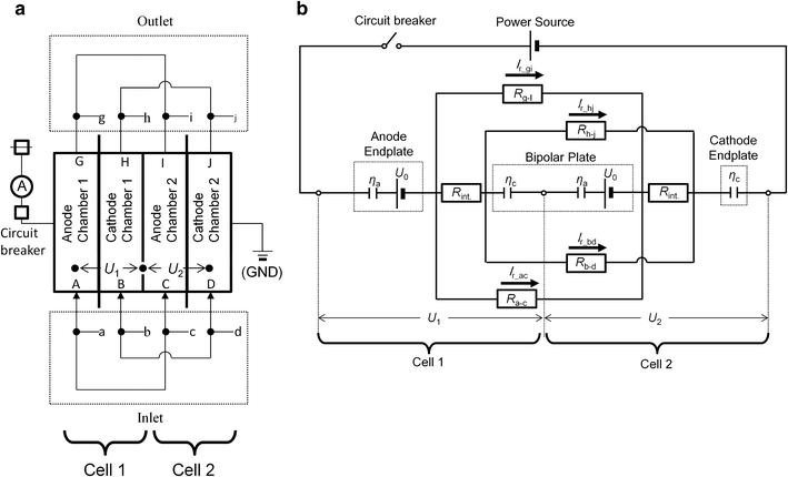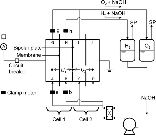 Before measuring reverse current from the cells, electrolysis was conducted for 60 min under the current density between 100 and 600 mA cm−2. By the timing of cutting current supply to the electrolyzer with the circuit breaker, measurement of reverse current as flowing ionic current through the plumbing and cell voltages was started. U 1 and U 2 are the cell voltages measured the anode and cathode terminals on cells, respectively. The reverse current was measured with a DC milliampere clamp meter (KEW 2500) at a, b, g, and h in Fig. 1.