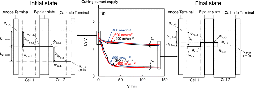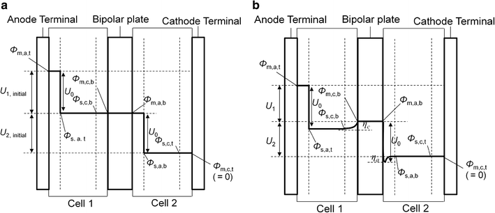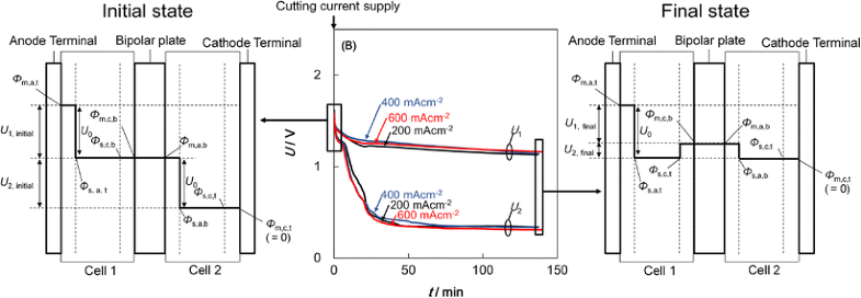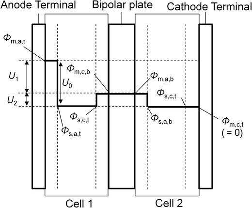 The symbols in Fig. 2 are defined as follows. U 1 and U 2 are the cell voltages of the anode terminal and the cathode terminal sides, respectively. Especially, U 1_initial and U 2_initial show the initial voltages just after electrolysis. U 0 shows the standard electrode potential difference between the anode and cathode, which is the electromotive force for the reverse current after electrolysis. The anode and the cathode are named for the water electrolysis, although the same terms are used even for the reverse current condition. Φ is the inner potentials, and the subscripts of s, c, a, t, and b are the solution (electrolyte), cathode side, anode side, terminal side, and bipolar plate side, respectively. The η c and η a are the overpotentials of the cathode side and the anode side on the bipolar plate, respectively. If the ohmic drop is negligible, Φ m,c,b is the same as Φ m,a,b, so that U 1 and U 2 are Φ m,a,t − Φ m,c,b and Φ m,a,b − Φ m,c,t, respectively.