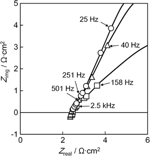 High-frequency intercept on real axis in Cole-Cole plot of the cells at 1.8 V (circles), 2.0 V (triangles), and 2.3 V (squares)