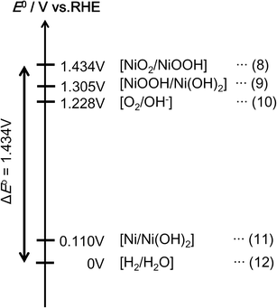 Candidates of the reverse current reaction with the electromotive force of U 0 were predicted by the Pourbaix diagram [18, 19] as follows. It should be reduction of the oxidized anode surface of NiO2 to NiOOH or NiOOH to Ni(OH)2, and dissolved oxygen to OH−, and the oxidation of the cathode surface of Ni to Ni(OH)2 or dissolved hydrogen to H2O.