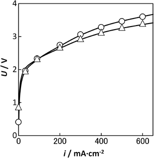 Relationship between loading current density and cell voltages: U 1 (circles) and U 2 (triangles)