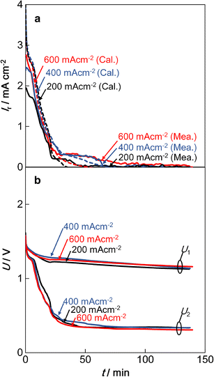 Reverse current of measured (solid line) and calculated (dashed line) with Eq. (7) (a) and cell voltages (b) as a function of time after 60 min of electrolysis at 200, 400, and 600 mA cm−2