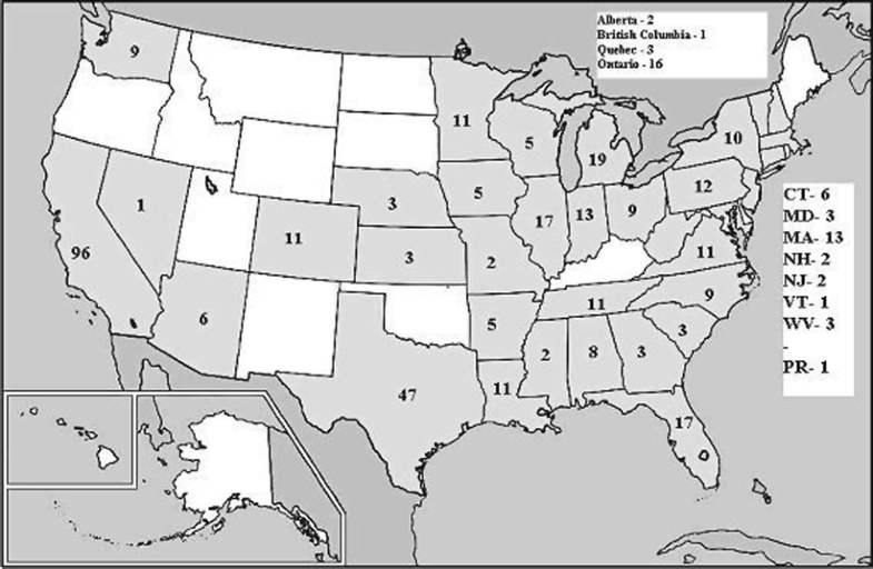 Regional distribution of cases reported as affected in North America. Note that the states/provinces with most affected pets were California > Texas > Michigan > Florida > Ontario. Blank state = no report
