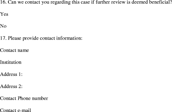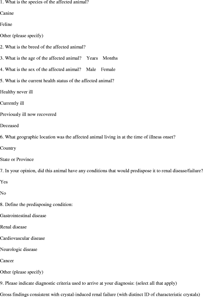 The survey asked (Q9) “Please indicate diagnostic criteria used to arrive at your diagnosis (select all that apply).” The respondents could select from a list of eight criteria plus other. Respondents who checked other were asked to specify the other diagnostic criteria they used (see Q9, Appendix). Veterinarians were asked (Q10) to specify other chemical markers present in their cases, which was another way of asking about other diagnostic criteria they used to determine that the case they were entering was indeed pet food related.