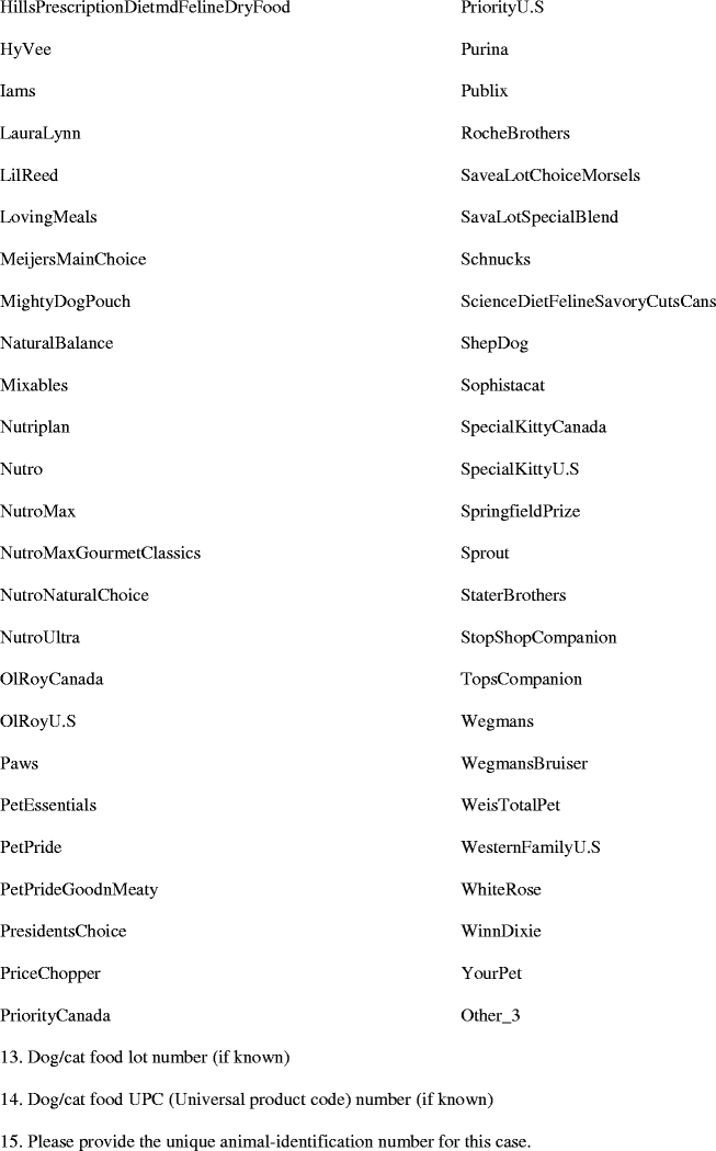 The survey asked (Q12), “Which dog/cat food(s) was the affected animal eating at the time of (or immediately preceding) the diagnosis? (Select all that apply).” The respondent could select from a list of food brands or specify particular brands not on the selection list under other. When other was entered, the brand was added to the final list of reported food brands. See Q12, Appendix, for the final list. Participants were able to check multiple food brands that were fed to the affected pet, if this were the case, so each case may have values in more than one category. Each category is treated as yes/no response. The rest of the questions (Q13–17) were designed to collect pet identification information, specific food lot numbers, and for identification of veterinarians completing the survey, their practice addresses, and contact information in case a follow-up was necessary.