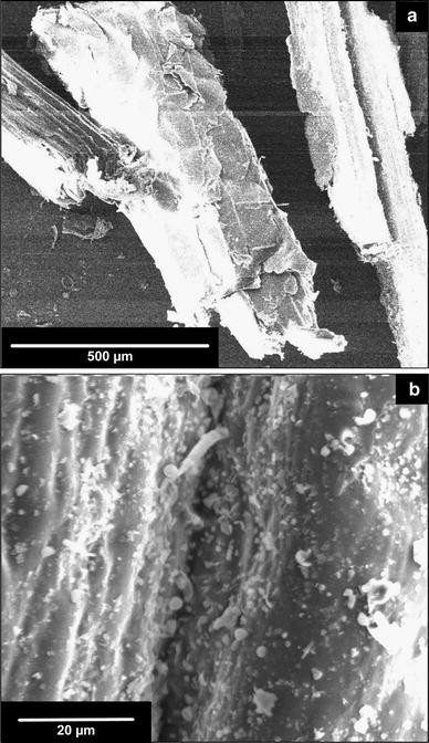 Sugarcane bagasse is collected from nearby sugar mill of Phagwara, Punjab, India and it is primarily washed with tap water at least four to five times. After that it is soaked into distilled water for 48 h and then dried for 24 h at 373 K. The dried material is pulverized to convert it into fine powder and then used as adsorbent for the removal of EB and MB. Studies about surface functional groups and surface morphology of SB have been made by the most widely used diagnostic techniques, i.e. FT-IR and SEM, respectively (Ferrero 2007; Garg et al. 2004; Hameed 2009). FT-IR spectroscopy study has been performed on Shimadzu FT-IR 8400S spectrometer. The sample is prepared with KBr and pressed into pellets. A spectrum is collected in the mid-IR range from 400–4,000 cm−1 with a resolution of 1 cm−1. The morphology and particle size of SB specimen has been examined by SEM. For SEM, the sample is dispersed onto carbon tape and coated with gold using a sputter coater system to prevent charge accumulation on the sample. The SB particles are then observed on a JEOL JSM-5800 microscope operating in SEM mode at 20 kV.
