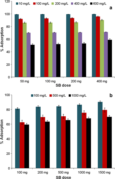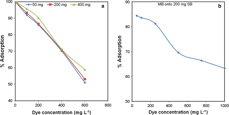 Variation in percentage adsorption with dyes concentration: a EB on three different SB doses, b MB on 200 mg of SB