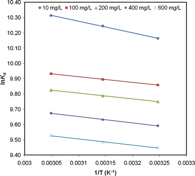 Variation of ln Kd with temperature (1/T) for the adsorption of EB onto SB (Van’t Hoff plot)