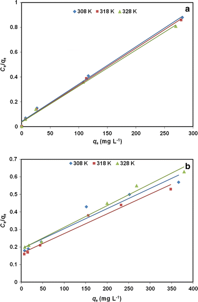 The RL parameter is considered as a more reliable indicator of adsorption. There are four possibilities for RL values: (1) for favourable adsorption, 0 < RL < 1; (2) for unfavourable adsorption, RL > 1; (3) for linear adsorption, RL = 1; and (iv) for irreversible adsorption, RL = 0 (Senturk et al. 2009). In both the cases, the values of RL (Table 3) are found to be positive and less than unity indicating thereby a highly favourable adsorption in all cases.