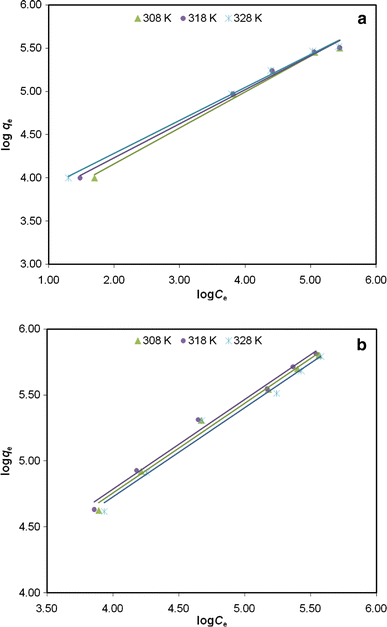 Freundlich adsorption isotherms for; a EB adsorption on SB and b MB adsorption on SB at three different temperatures