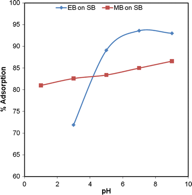 Effect of initial pH of the medium on the adsorption of EB and MB on SB