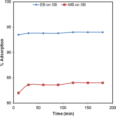 Effect of contact time between the adsorbent and adsorbate on the percentage adsorption of EB and MB on SB