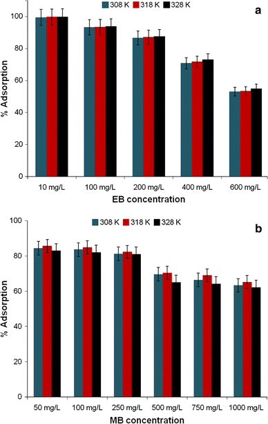 Effect of temperature on percentage adsorption of: a EB on SB and b MB on SB at different dye concentrations