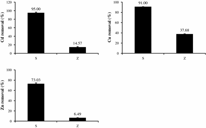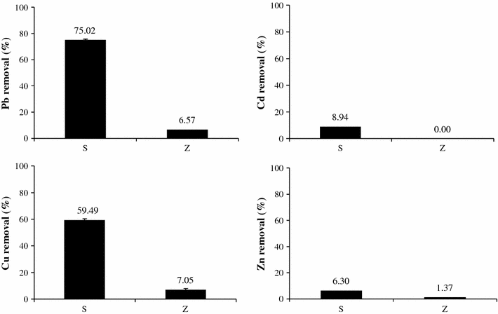 Batch sorption, a technique commonly used to obtain data on the removal efficiency of a given sorbent under static conditions, was selected as an appropriate technique in the current study. Polypropylene tubes containing 20 mL of metal solution and 3 g/L of limestone powder from the <210 μm-sized samples (S or Z) were shaken at 200 rpm at 25 °C for 60 min to reach equilibrium. In single, binary and multi-element systems, 10 mg/L of each metal was used as an initial concentration to achieve similar concentration for all systems (molar concentration: [Pb] = 4.82 × 10−5 mol/L, [Cd] = 8.89 × 10−5 mol/L, [Cu] = 1.57 × 10−4 mol/L and [Zn] = 1.52 × 10−4 mol/L). For instance, in quadruple system, 5 mL of each metal stock solution (1,000 mg/L) were introduced in 500 mL volumetric flask and then diluted with UPW to obtain an initial concentration of 10 mg/L for each metal. The initial pH of the solution was adjusted to 6 with 0.1 M HCl and 0.1 M NaOH prior to mixing with limestone powder (Sdiri et al. 2012b). After shaking, 10 mL of supernatant were withdrawn and filtered through a 0.2 μm syringe-driven filter (Millex-LG, PTFE, Millipore Corp., Ireland). After the reaction, the sample solutions were stored at 4 °C until analysis for Pb2+, Cd2+, Cu2+ and Zn2+ with an ICP-AES instrument, Optima 7300 DV series (PerkinElmer Inc., Tokyo, Japan). The amount of a metal removed from the solution was calculated as the difference between initial and final concentrations. The same experimental conditions were maintained for mixed systems (i.e., binary, ternary and quadruple mixtures). All experiments were run in triplicate.
