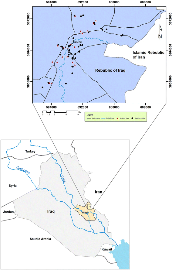 Two major aquifer systems exist within the study area. The first one represents the shallow unconfined aquifer consisting mainly of layers of sand, gravel with overlapping clay, and silt (Al-Abadi 2015b). This hydrogeological unit is located within the Quaternary lithological layers. The second hydrogeological unit is Muqdadiyah water-bearing layer. The aquifer condition of this unit is confined/semi-confined. The regional groundwater flow is from northeast to southwest. The hydraulic characteristic of the two units was estimated by Al-Shammary (2006) by means of pumping test. For the unconfined aquifer, the hydraulic conductivity, transmissivity, and specific yield were 6.3 m/d, 228.43 m2/d, and 0.042, respectively. For the confined aquifer, the values were 3.5 m/d, 81.07 m2/d, and 0.0017 for hydraulic conductivity, transmissivity, and storage coefficient, respectively.